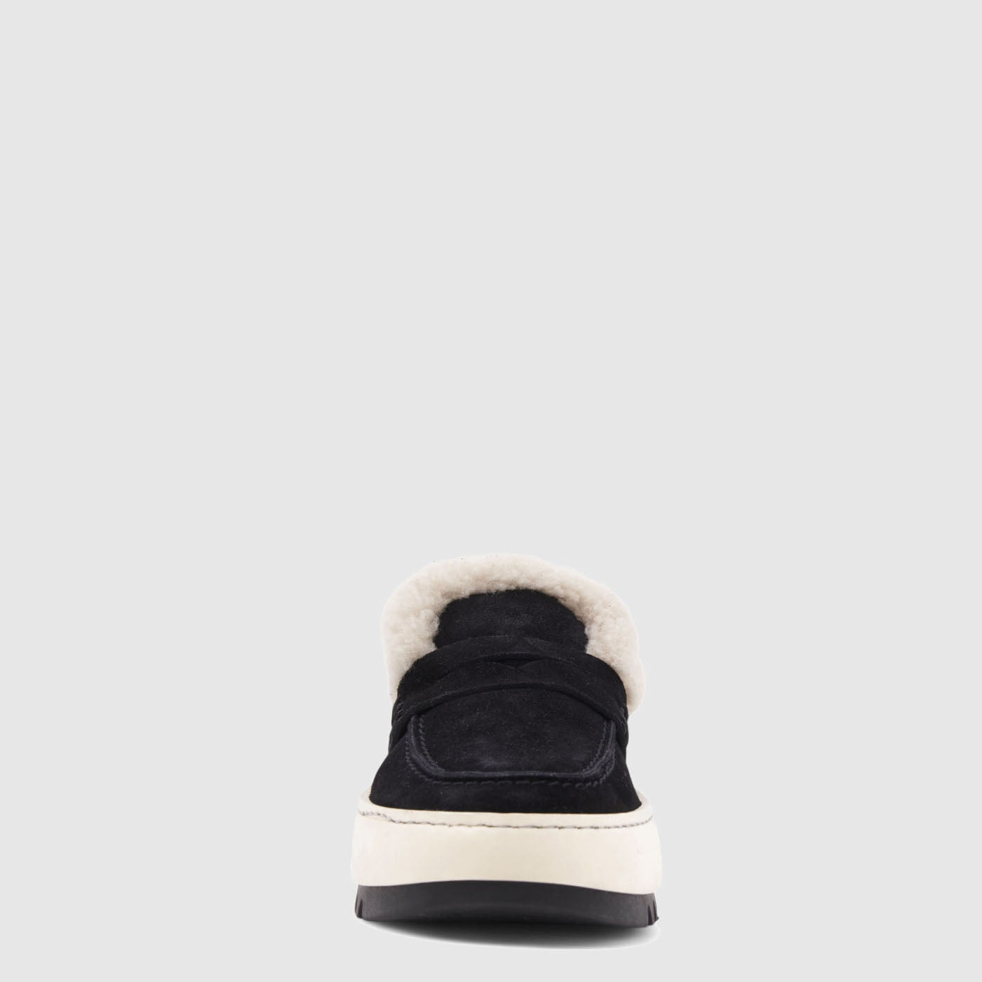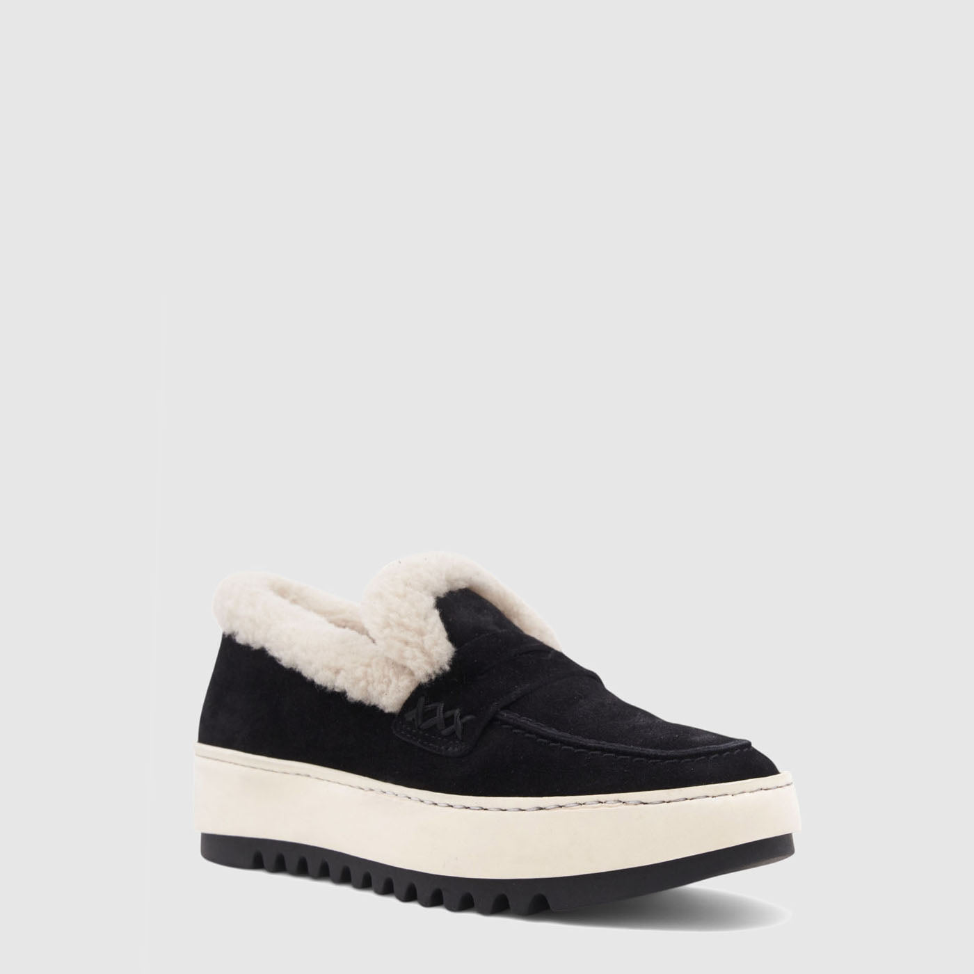 Integrating modern sophistication with classic comfort, the Amelia flats are inspired by the elegance of loafers combined with the functionality of a sneaker. Constructed from supple water-resistant suede, they feature classic penny slots and are set on chunky rubber outsoles that provide incredible durability and traction. The shearling lining is sure to keep your feet cozy in the most blustery conditions.