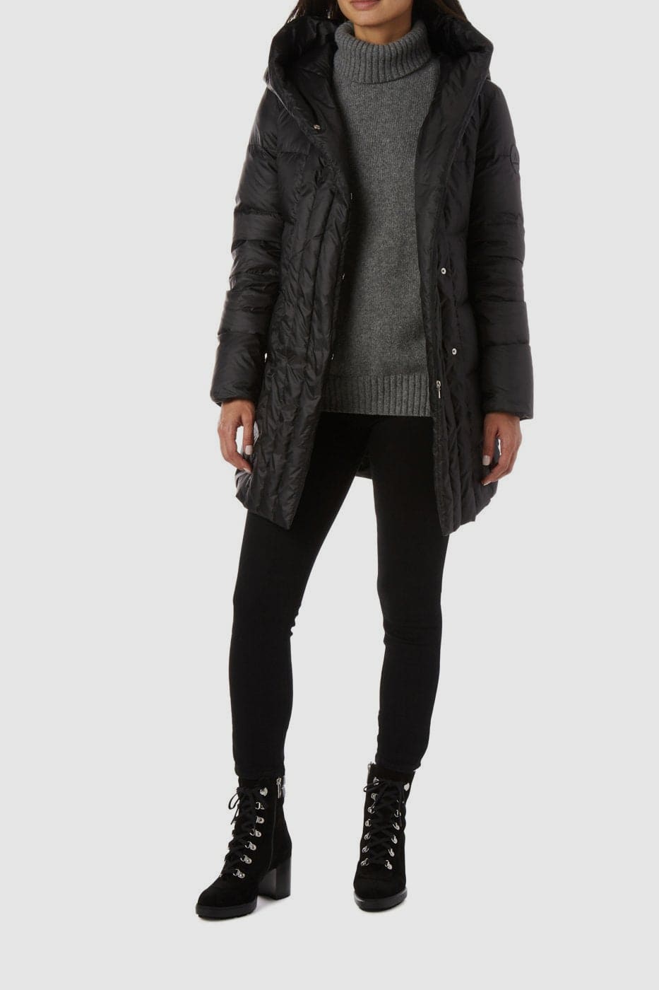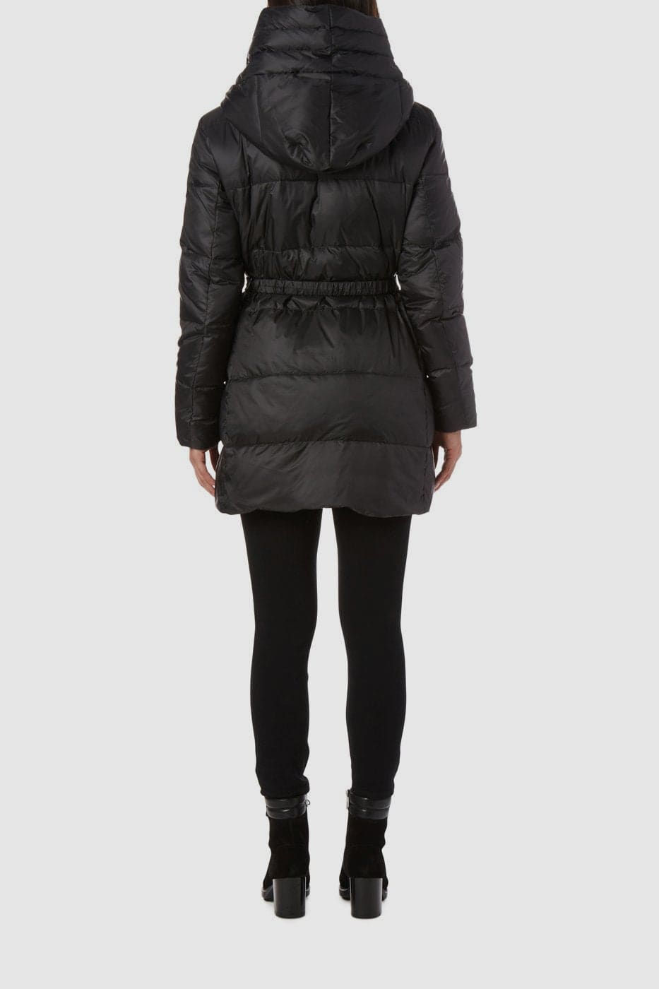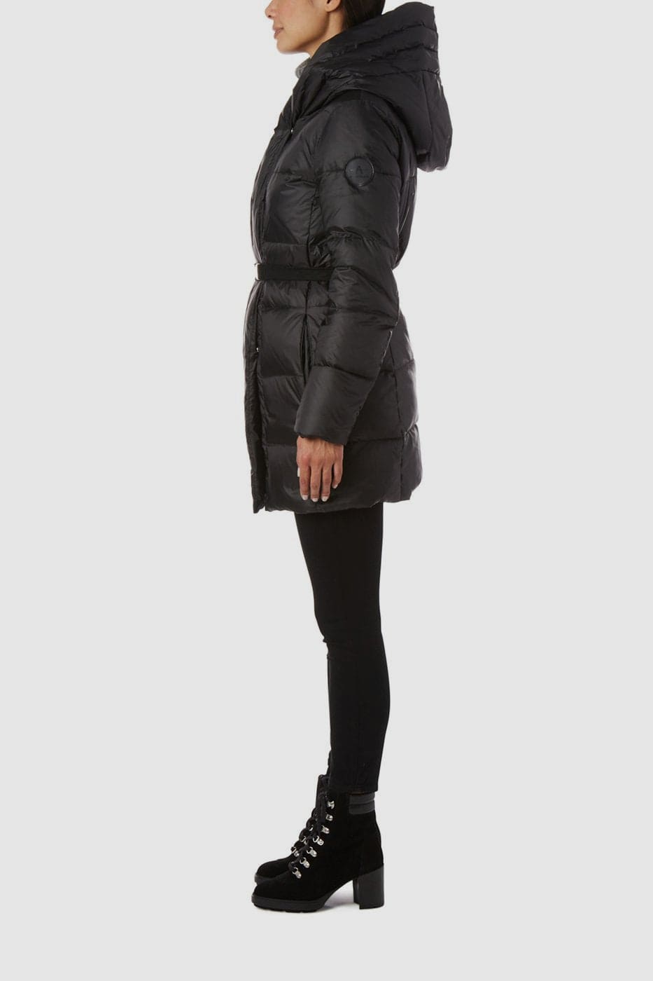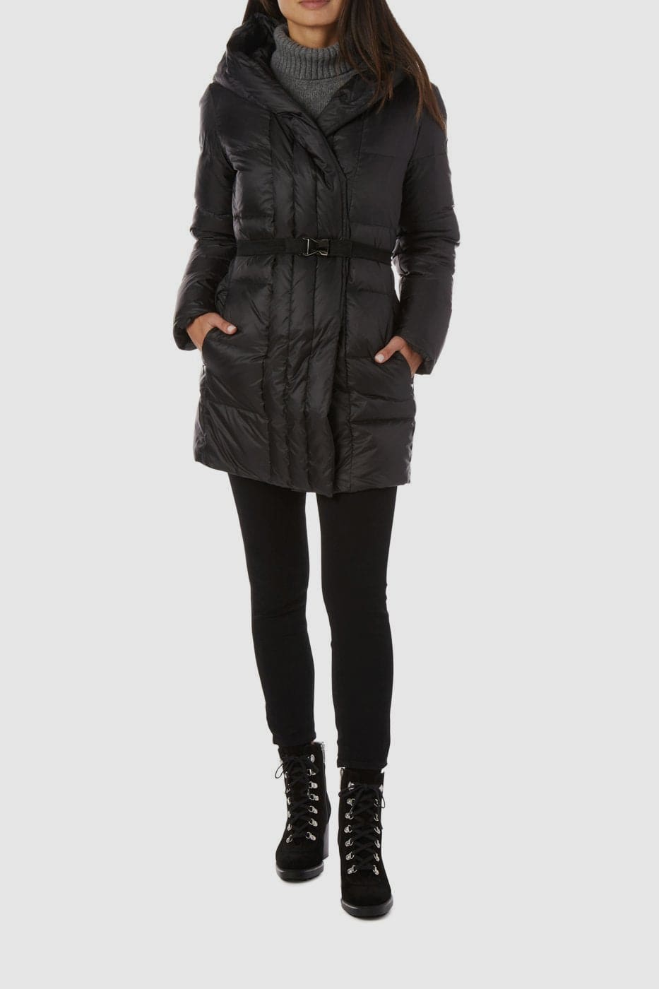 Made from Italian fabric genuine down filling, this luxurious mid length puffer jacket features a belt with a zipper and snap closure.