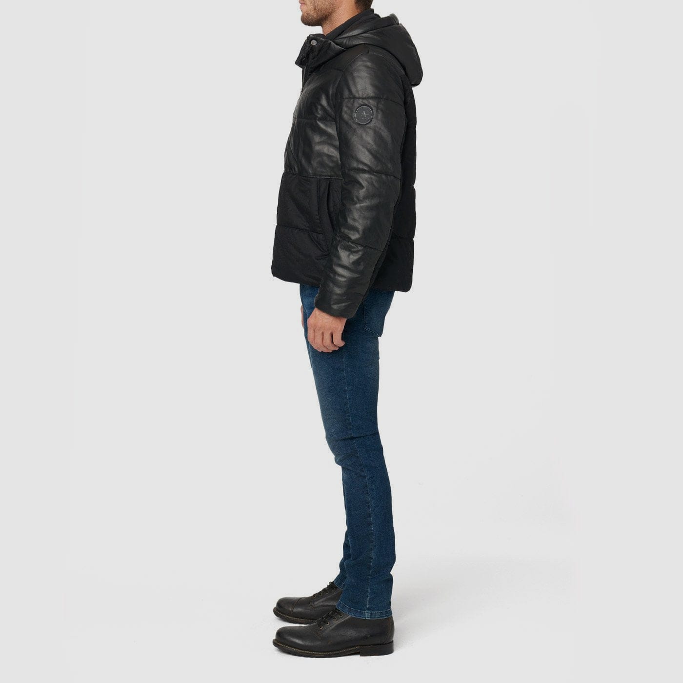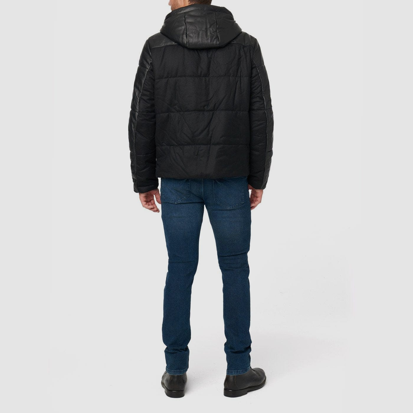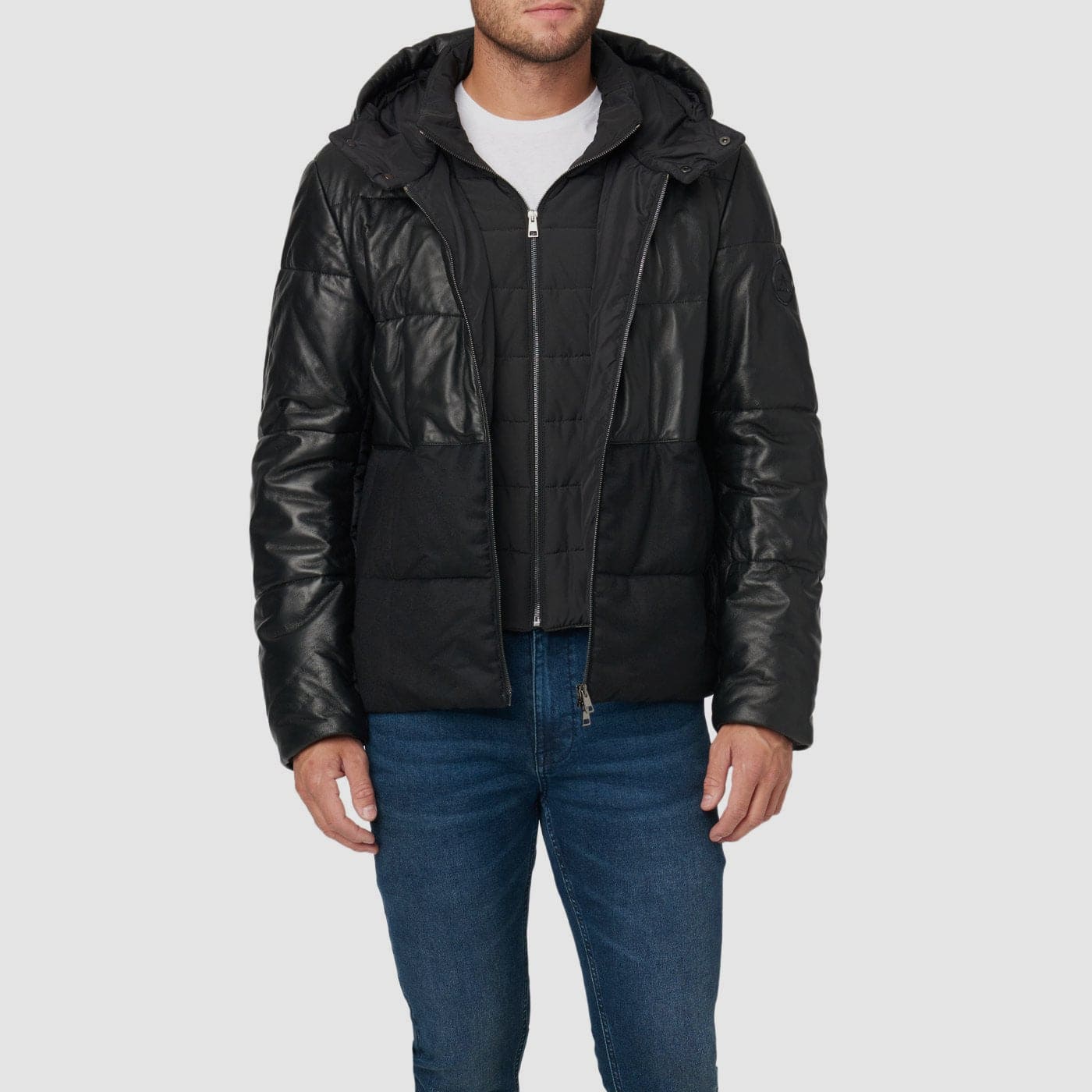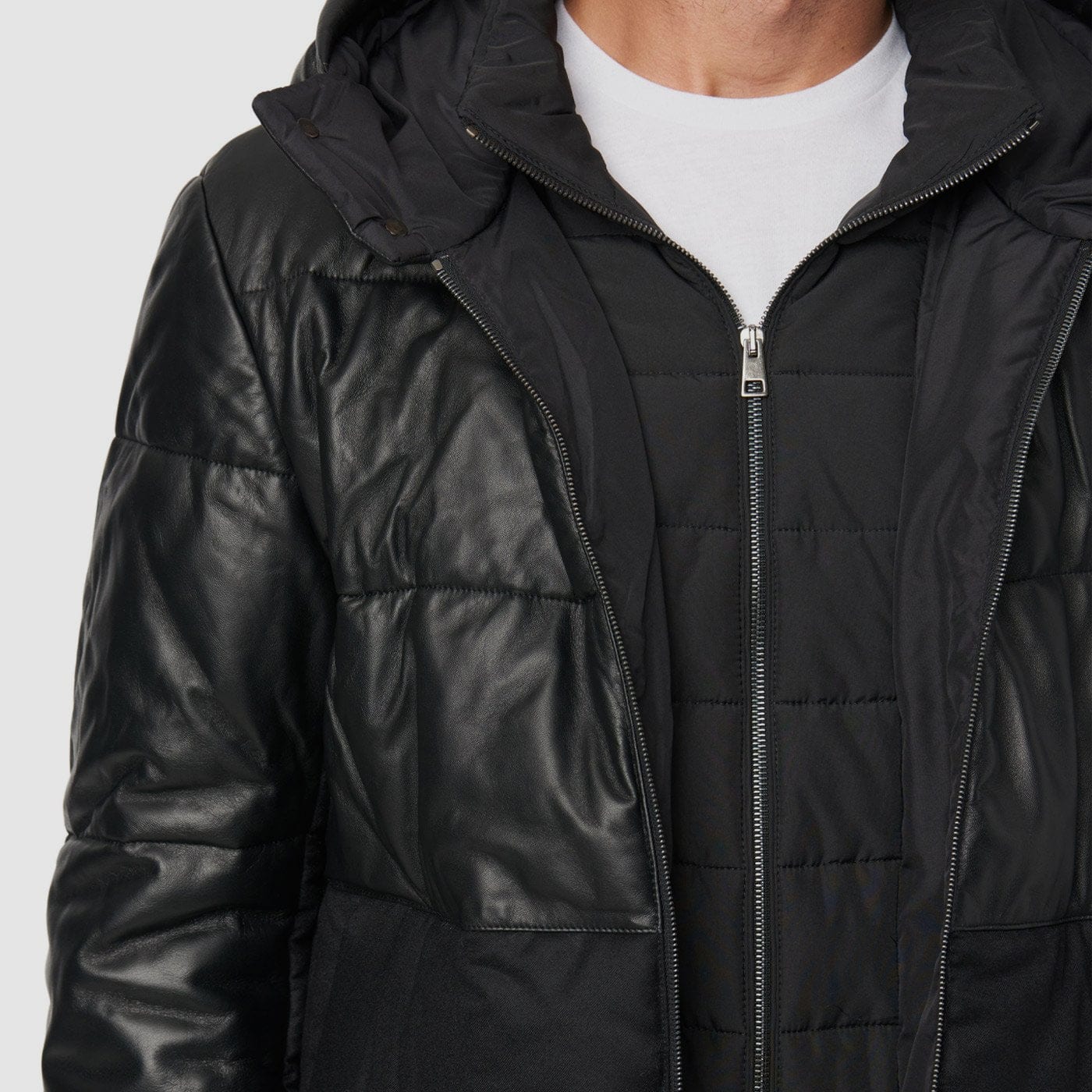 Expertly crafted in premium leather and nylon, this jacket has a hood and lining that has a separate closure for extra warmth. Features a zipper closure and 2 pockets.