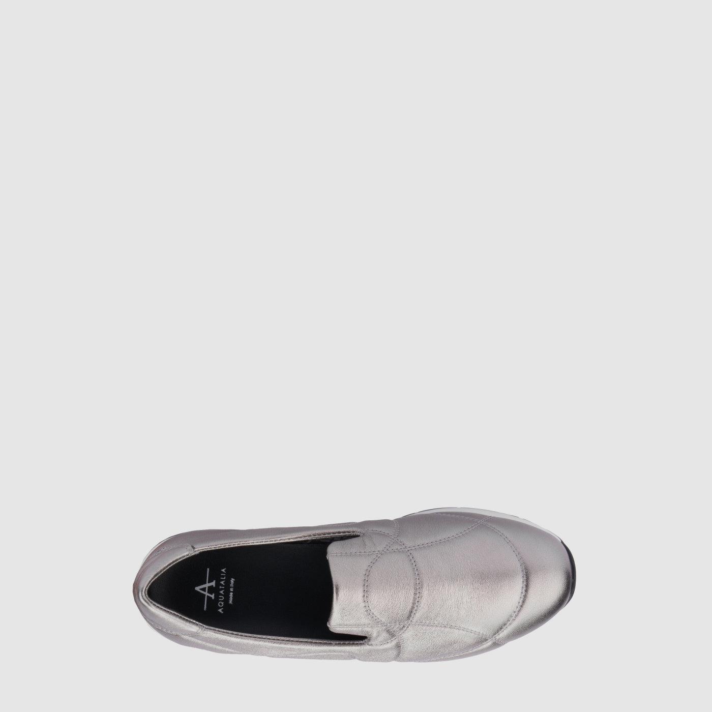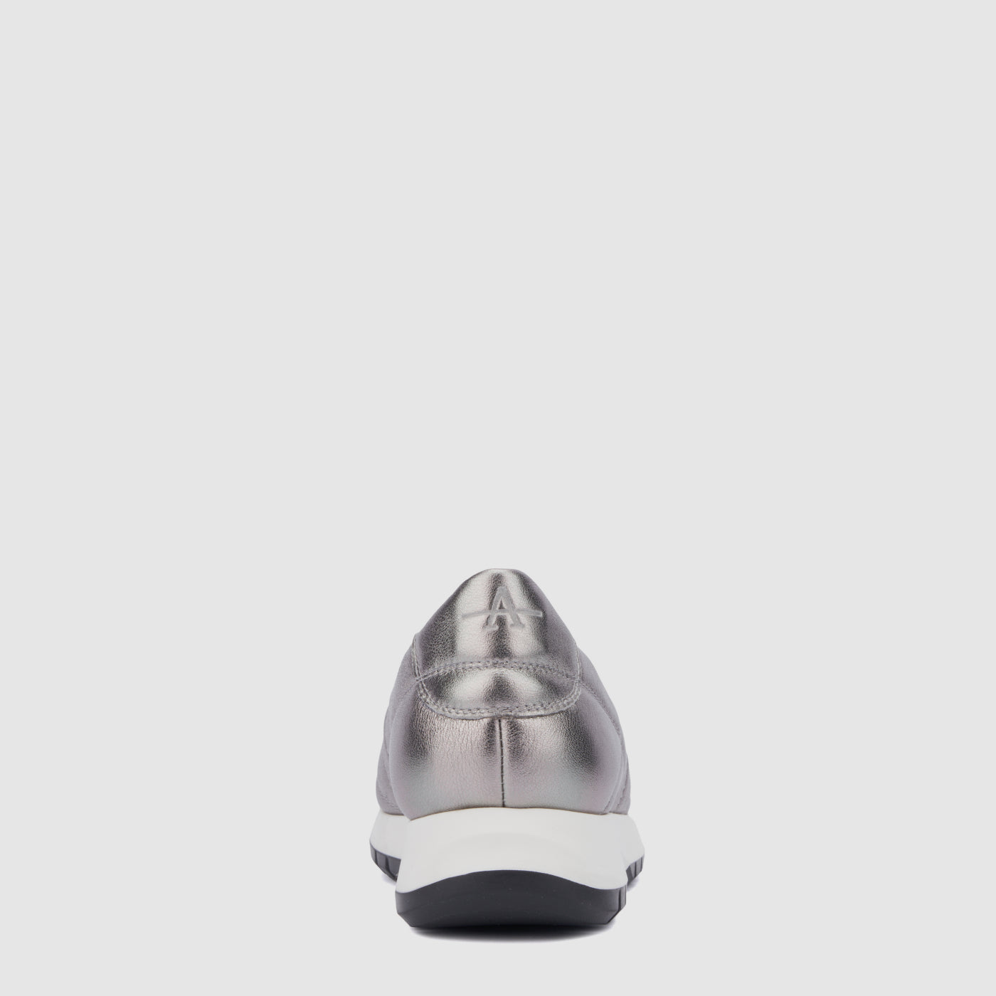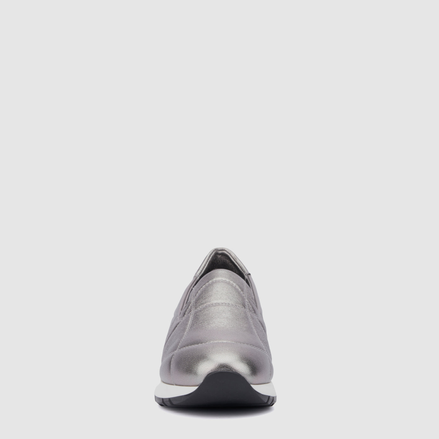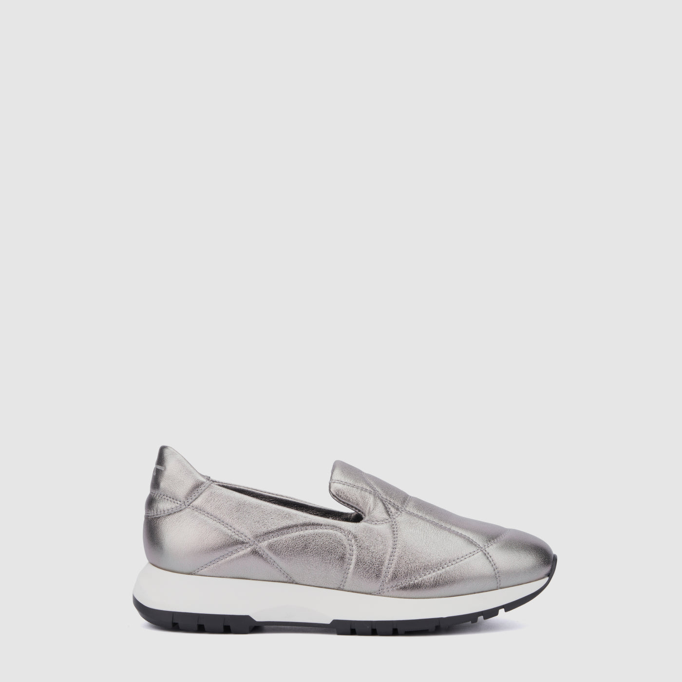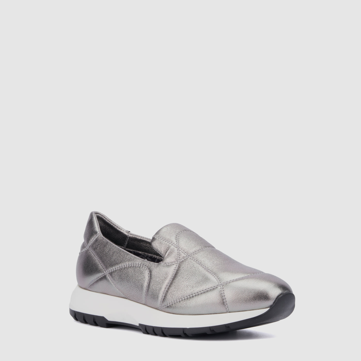 Sporty yet sophisticated, quilted detailing elevates the Katya Sneaker. Crafted in smooth nappa leather (black) or dusted metallic leather (silver), its round-toe shape enhances the comfort factor. Whether paired with sleek leggings or faded jeans, the slip-on design delivers ease of wear.