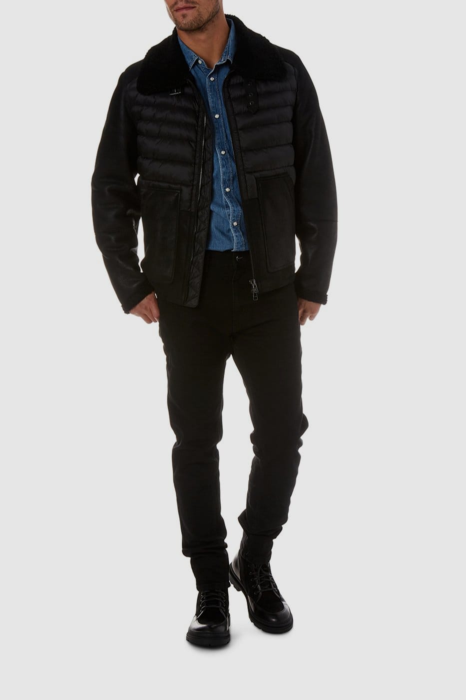 Expertly crafted in premium nylon and shearling, this jacket features a collar with a buckle, a zipper closure, and 2 pockets.